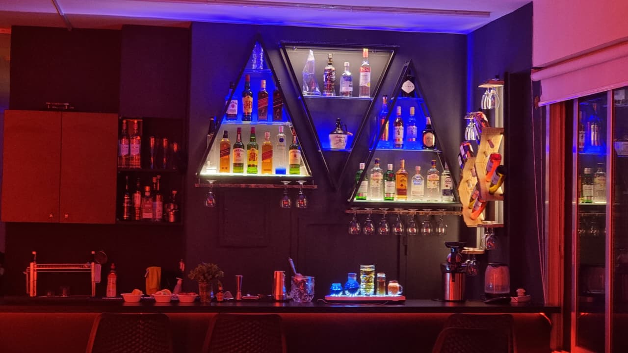 WHISKEY, DASHES ORANGE BITTERS, LEMON, SUGAR SYRUP, BLUE CURACAO FLOAT